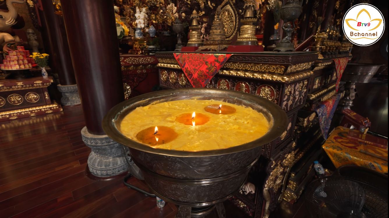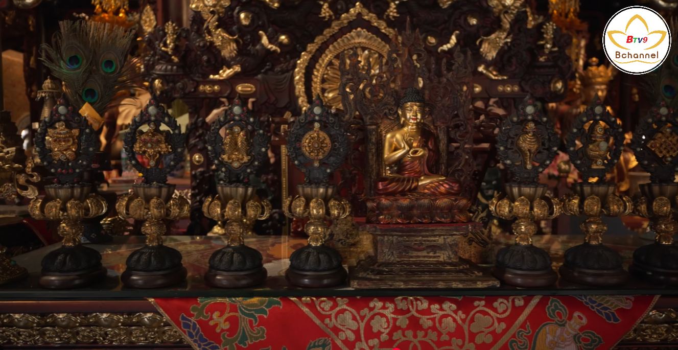 Một điểm nhấn đặc sắc trong không gian Tam Bảo chính là sự hiện diện của bát cát tường được xếp thành một hàng ngang ngay trên pháp tòa. Đây là một trong những pháp khí quan trọng của Phật giáo Mật Tông, biểu trưng cho tám điều cát tường, tám điềm lành cao quý của đạo Phật. Từng biểu tượng đều mang một ý nghĩa sâu sắc: từ chiếc lọng che chở, bánh xe pháp luân, cặp cá vàng song hành, hoa sen thanh khiết, bình cam lồ, nút thắt vô tận cho đến vỏ ốc trắng và cờ chiến thắng.