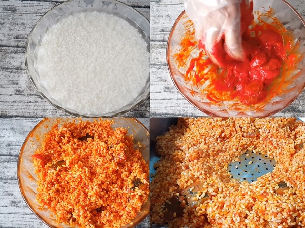 3. Trộn gạo nếp với thịt gấc, thêm chút muối.