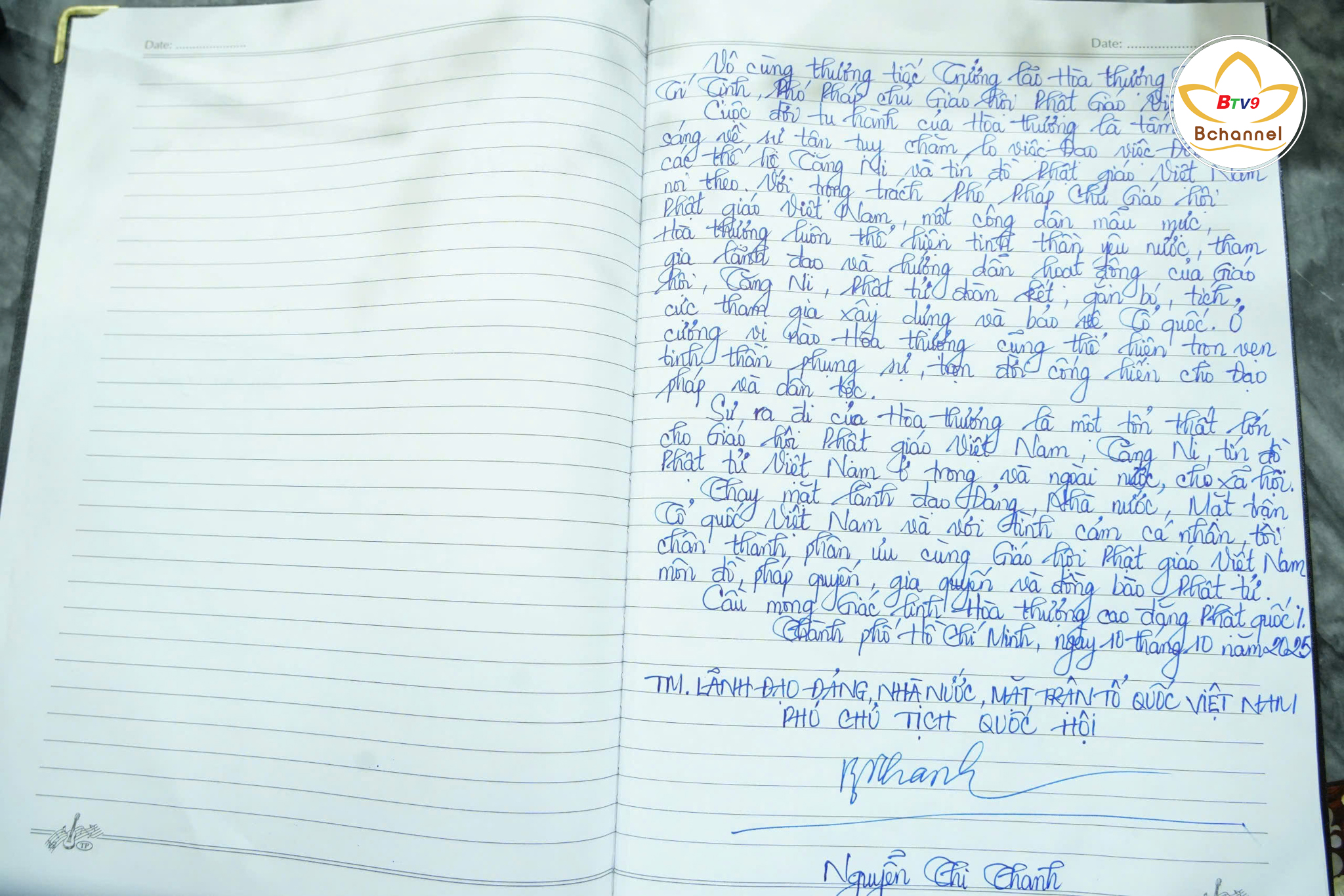 Trong sổ tang, Phó Chủ tịch Quốc hội Nguyễn Thị Thanh trân trọng ghi lời tưởng niệm, bày tỏ lòng kính phục đối với một bậc Cao Tăng đã cống hiến trọn đời cho sự nghiệp hoằng dương Chánh pháp, góp phần củng cố khối đại đoàn kết toàn dân tộc, xây dựng Giáo hội Phật giáo Việt Nam ngày càng trang nghiêm, hòa hợp, phát triển bền vững.