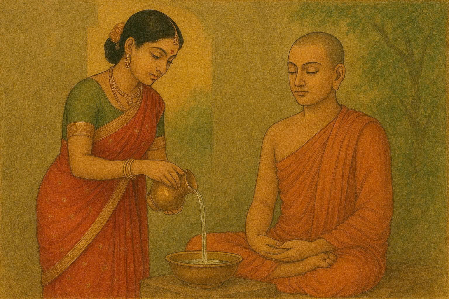 Khi cô gái than không có gì để bố thí, Tôn giả chỉ mỉm cười, đưa bình bát ra và bảo: