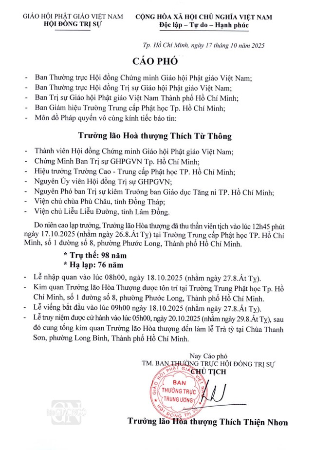 Trưởng lão Hòa thượng Thích Từ Thông - Thành viên HĐCM GHPGVN, Hiệu trưởng Trường Trung cấp Phật học TP.HCM đã an nhiên viên tịch trưa 17-10-2025, trụ thế 98 năm.