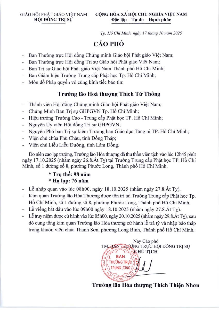 Trưởng lão Hòa thượng Thích Từ Thông - Thành viên HĐCM GHPGVN, Hiệu trưởng Trường Trung cấp Phật học TP.HCM đã an nhiên viên tịch trưa 17-10-2025, trụ thế 98 năm.